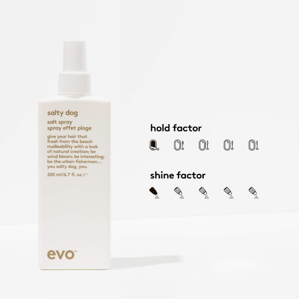 Salty Dog Salt Spray zorgt voor beachy, getextureerde kapsels – zonder het zand. Deze stylingspray geeft het haar natuurlijke hold en textuur, en bevat glycerine om het haar gehydrateerd te houden en uitdroging te voorkomen. Salty Dog kan eenvoudig gecombineerd worden met andere Evo-stylingproducten om natuurlijke textuur en separatie te creëren.