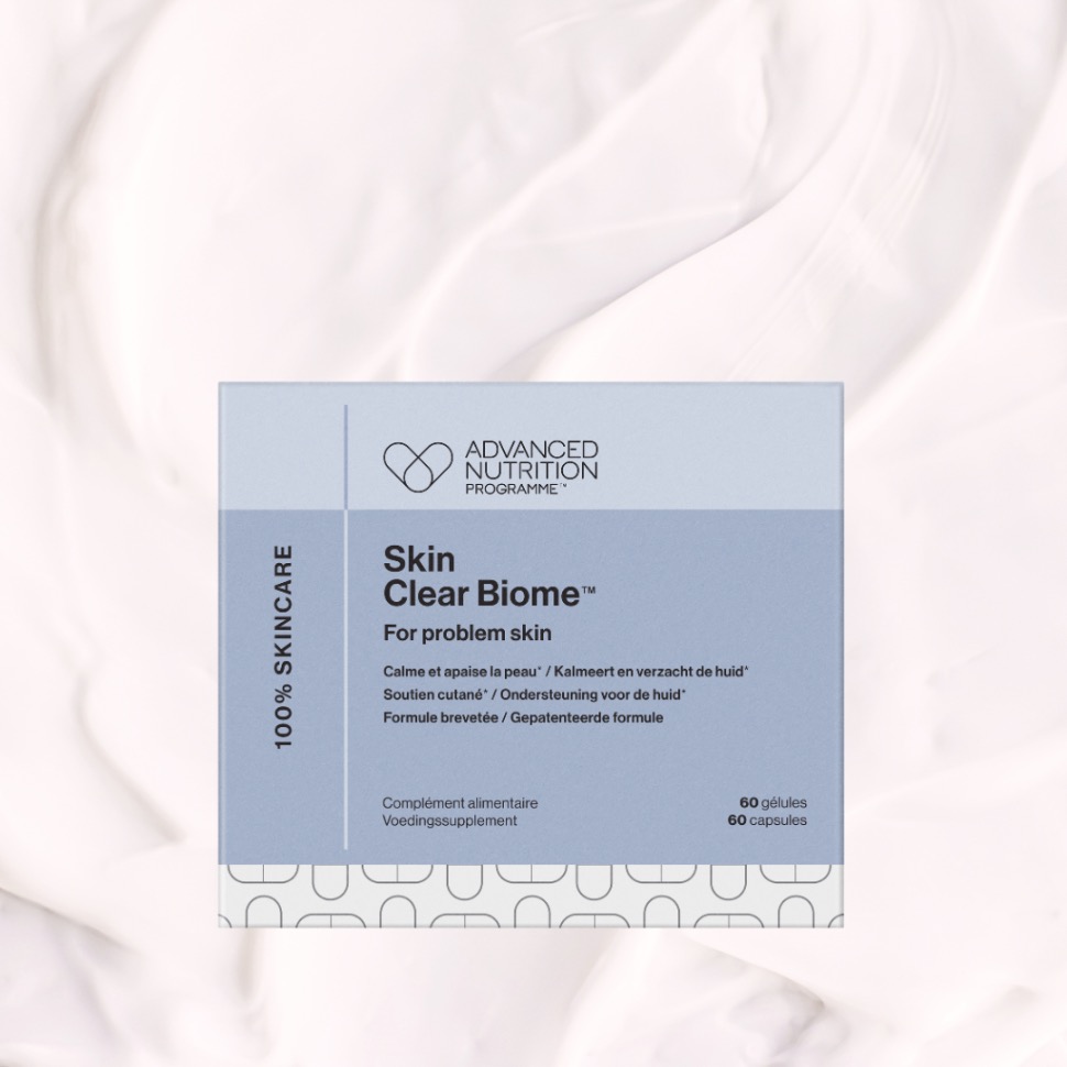 Met de microbioom-technologie waarvoor een patent is aangevraagd, is Skin Clear Biome™ een huidsupplement van de volgende generatie, geformuleerd door experts van Advanced Nutrition Programme™ om de verbinding tussen gezonde darmen en een gebalanceerde huid te voeden.