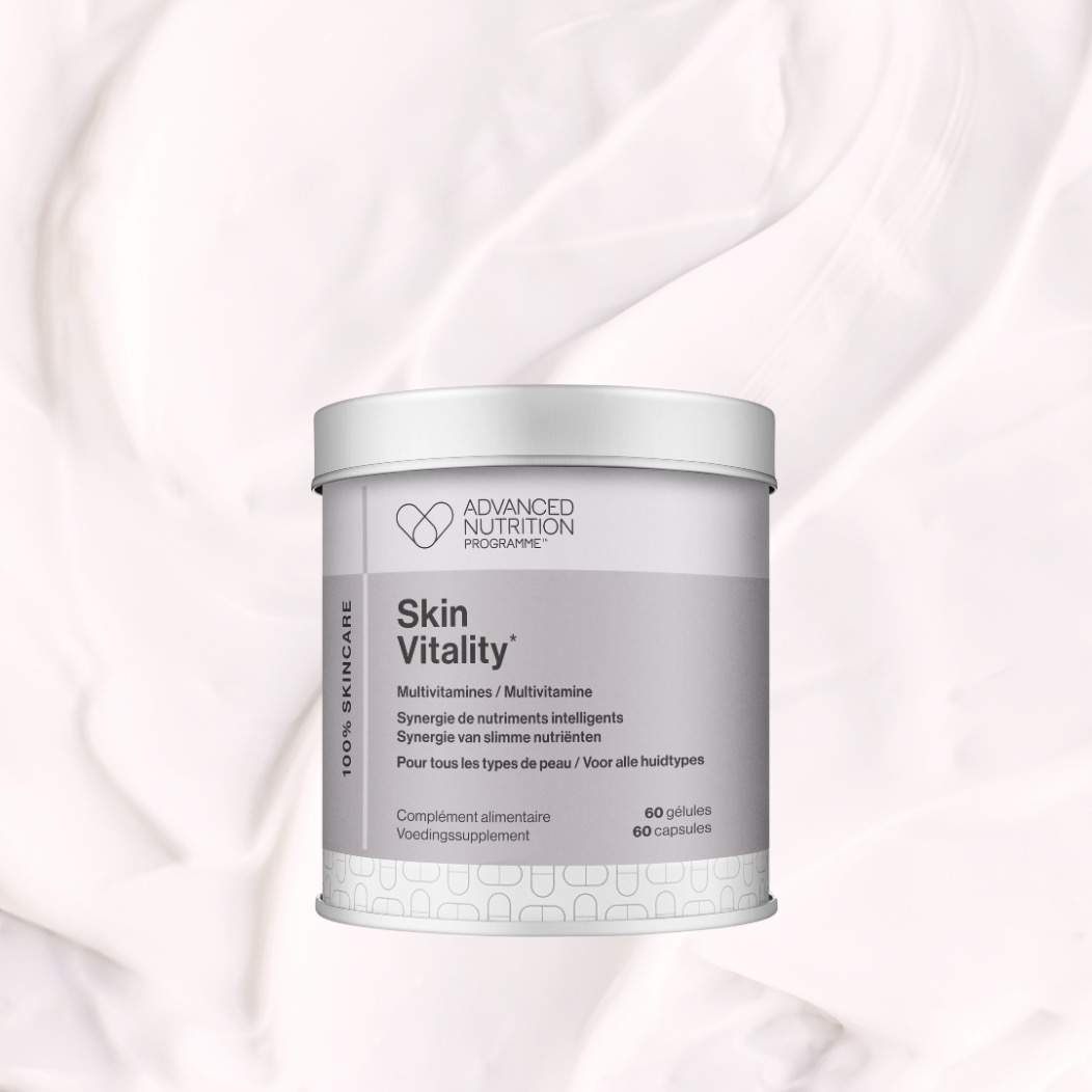 Skin Vitality is een multivitamine, strategisch geformuleerd door de experts van Advanced Nutrition Programme. Dit supplement levert maar liefst 28 slimme voedingsstoffen in één handige, plantaardige capsule voor de algehele gezondheid van huid, nagels, haar en lichaam.