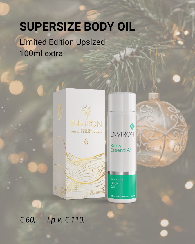 Tijdens de festive actie ontvang je tijdelijk 100 ml extra gratis bij de vertrouwde Vitamin A, C & E Body Oil van Environ – een prachtige kans om je huid net dat beetje extra liefde te geven in de koudere maanden.